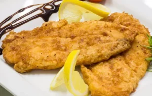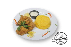 Șnițel de șalău cu cartofi prăjiți și salată