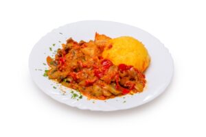 Pârjoluțe moldovenești cu pilaf de orez și salată de varză albă cu morcovi