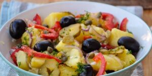 Pulpe de pui la tavă cu cartofi prăjiți și salată